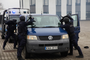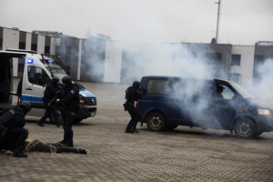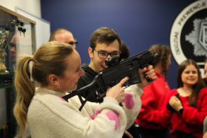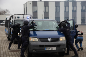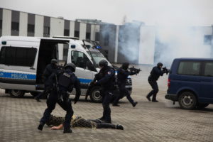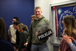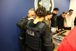 Na zakończenie wizyty odbył się emocjonujący pokaz w wykonaniu Plutonu Wsparcia Taktycznego (PWT). Funkcjonariusze PWT zaprezentowali skuteczne metody interwencyjne, m.in. obezwładnienie osoby agresywnej z wykorzystaniem siatki, a policjanci Plutonu Wzmocnienia pokazali działanie nowoczesnej armatki wodnej. Demonstracja wzbudziła duże zainteresowanie uczestników, podkreślając profesjonalizm i innowacyjność stosowanych technik.