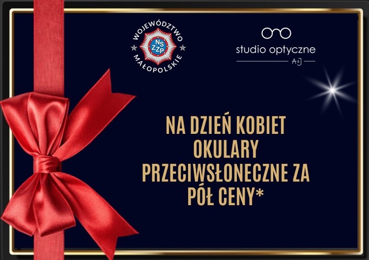 Z okazji Dnia Kobiet partner NSZZ Policjantów Województwa Małopolskiego – Studio Optyczne A&J – przygotował wyjątkowy voucher dla Członków NSZZ Policjantów oraz ich Rodzin. Voucher dostępny w aplikacji MÓJ NSZZP dla zarejestrowanych Członków Związku.