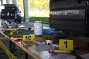 stanowisko Laboratorium Kryminalistycznego, prezentujące metody ujawniania i zabezpieczania śladów,