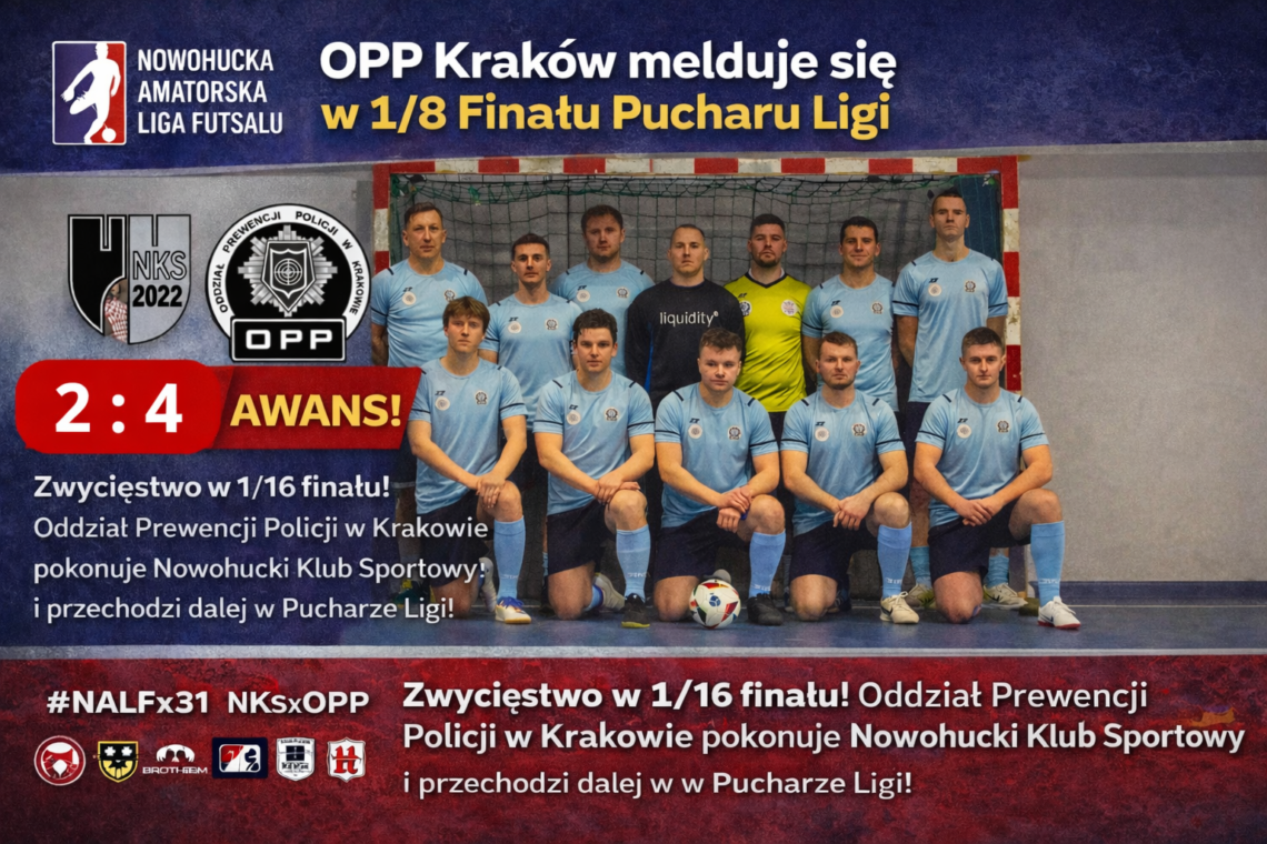 Środowy wieczór przyniósł sporo emocji na futsalowym parkiecie w Krakowie. W spotkaniu 1/16 finału Pucharu Ligi drużyna Oddziału Prewencji Policji w Krakowie pokonała Nowohucki Klub Sportowy NKS 4:2, zapewniając sobie awans do kolejnej rundy rozgrywek.