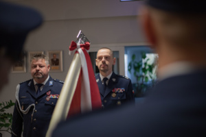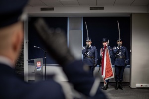 Następnie odbyła się ceremonia pożegnania i powitania ze sztandarem Komendy Wojewódzkiej Policji w Krakowie. Zdający obowiązki komendanta wojewódzkiego insp. Piotr Morajko pożegnał się ze sztandarem, natomiast ze sztandarem przywitał się obejmujący to stanowisko insp. Artur Bednarek.