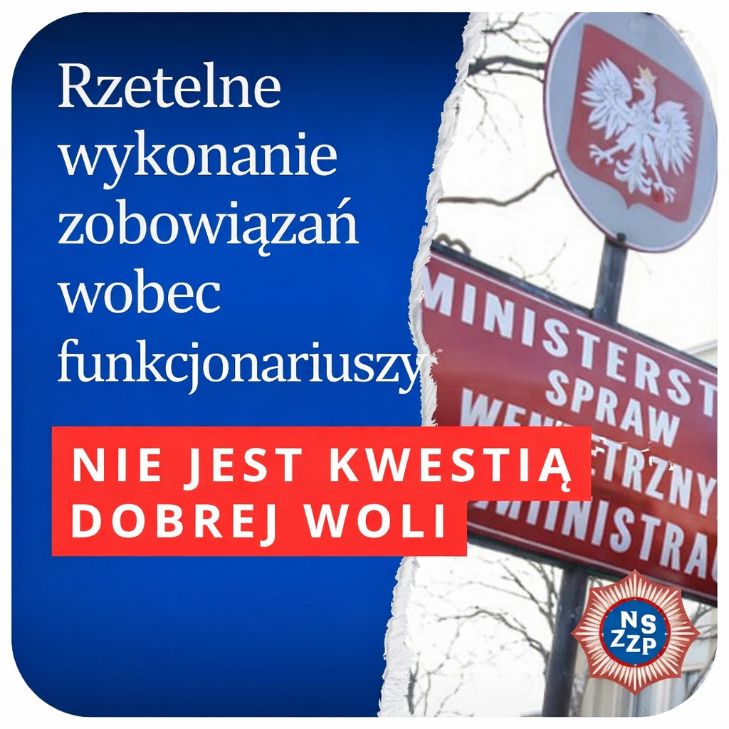 Zarząd Główny NSZZ Policjantów wezwał Ministra Spraw Wewnętrznych i Administracji do niezwłocznego podjęcia działań zmierzających do pełnej realizacji postanowień Porozumienia z dnia 6 marca 2025 r. Związek podkreśla, że dalsza opieszałość w realizacji zobowiązań skutkować będzie konsekwencjami przewidzianymi w tym dokumencie.